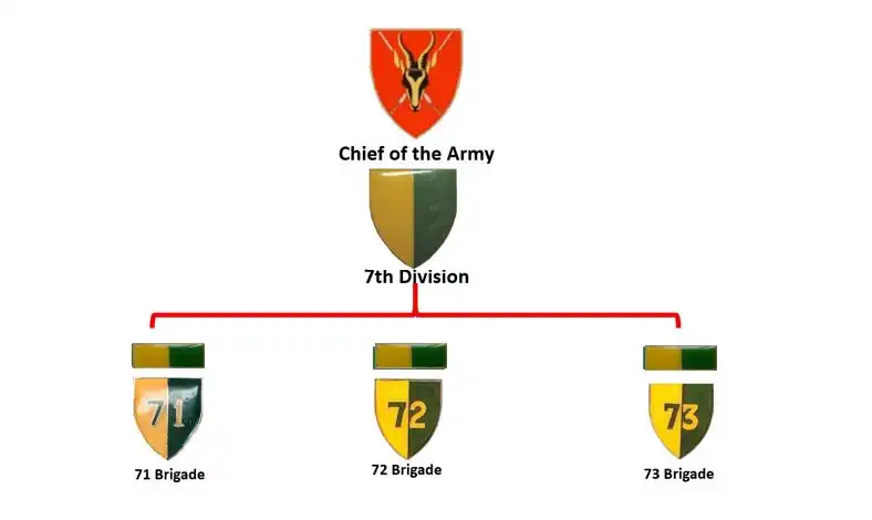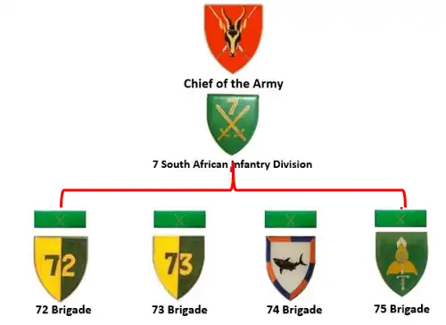 By 1985, 7 Division consisted of 71 Motorised Brigade, 73 Motorised Brigade and 82 Mechanised Brigade. 72 Motorised Brigade had been transferred to the command of 8th South African Armoured Division.