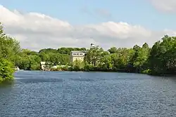 The second mill began producing nails in 1814, and five years later its owner, Ruggles Whiting of Boston, sold it to the owner of the first mill, George Bird, who began using the whole site to manufacture paper.[1] In 1823 it switched to cotton, using the machinery of the former Norfolk Cotton Company. In 1835 a new stone mill was erected.[3] It stands today, and was converted into a condominium complex in 1986–87.[4] Unlike the other mills, which were constructed in a strictly utilitarian style, this factory boasted a date stone reading "1835" and a dome-roofed cupola over the mill bell.[2] Together they stood as a testament to the primacy of the mills in the neighborhood.[2][5]