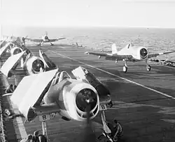 In January 1943, the USS Charger served as the carrier for deck landing exercises, following which the squadron was embarked in the Illustrious-class aircraft carrier, HMS Victorious on 1 February. This transition coincided with HMS Victorious's deployment to the Pacific, navigating through the Panama Canal to join forces with the United States Pacific Fleet.[5] The USS Hornet was sunk, while the USS Enterprise incurred considerable damage during the Battle of the Santa Cruz Islands. This left the United States Navy with only one functioning fleet carrier, the USS Saratoga, in the Pacific theater. In light of a request for further carrier assistance, the British aircraft carrier HMS Victorious was provided to the US Navy on loan in late December 1942.[7]