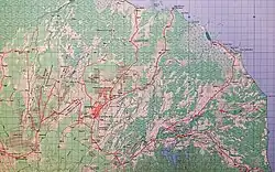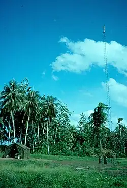 A cornerstone of the high quality scale 1:100,000 topographic line maps produced of the entire country in the 1970s was the geodetic survey on which the topographic survey was based. The high order astronomic/triangulation/trilateration network through the Papua and New Guinea highlands was undertaken by Australia's Division of National Mapping (DNM) 1962–1965.[10][11] At the same time (1962 and 1963) Topo Sqn AHQ Svy Regt undertook a high order coastal traverse around mainland Papua and New Guinea with intersections to the DNM highlands survey when the beacons were visible.[12] The rapid progress of surveys in the 1960s would not have been possible if it was not for the technological development of the microwave electromagnetic distance measurement man-portable system Tellurometer and using helicopters capable of positioning and resupplying survey parties on high altitude survey stations between 10,000 feet and 15,000 feet above sea level. In 1963 the Australian Government was very concerned about the land border with Indonesia an area very poorly mapped. RA Svy used a new Radar Airborne Profile Recorder to map the border area which required additional horizontal and vertical control such that height contours could be mapped. In 1964, Topo Sqn AHQ Svy Regt undertook a three-year program of topographic survey control for scale 1:100,000 mapping of a three degree longitude band east of the land border. Horizontal control was by trilateration network using a new airborne electromagnetic distance measurement system, Aerodist MRC2, connected to the high order surveys established by RA Svy and DNM 1962 -1965. [13] Mixed results were achieved with mapping photography of the border area in the 1960s. At the same time a US Air Force airborne High Frequency Ranging and Navigation (HIRAN) trilateration network measuring long lines between ground stations connected Australia, Papua, New Guinea, New Britain, New Ireland and Buka (Bougainville) to a wider South West Pacific Survey to the north-east.[14] All of these surveys contributed to the 1966 Australian geodetic network adjustment and the resulting coordinate set in the Australian Geodetic Datum 1966. Australia had decided to map the entire Territory at scale 1:100,000 and control surveys for the remainder of mainland PNG were taken up on operations from four to nine months long by Northern Command Field Survey Unit/1 Fd Svy Sqn (Brisbane) mainly using Aerodist MRC2 in 1969 and 1970, and by 4 Fd Svy Sqn (Adelaide) mainly using Aerodist MRB3/201 (computer assisted) from 1972 to 1974 and portable Transit Doppler satellite (US Navy navigation satellites) AN/PRR-14 Geodetic Receiver (Geoceivers) in 1974. In 1970 a British Royal Engineer Survey Troop was attached to 1 Fd Svy Sqn. Vertical (height) control for the mapping was a combination of trigonometric heighting, barometric heighting by Army Sioux helicopter, levelling with connections to sea level and WREMAPS II Airborne Profile Recorder (APR).[6][9][15][16] [13] [17]
