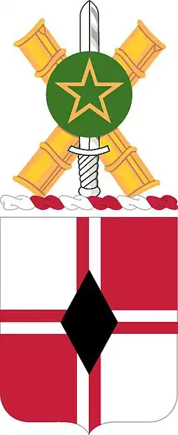 Approved on 19 January 1956, the Coat of Arms consists of two crossed bamboo poles, an upright sword as well as a green disk with gold star in the center, placed above the scarlet and white shield with the black diamond symbol in the center. This represents the unit's war service in Vietnam. According to The Institute of Heraldry, "The crossed bamboo poles symbolize the general support, rebuilding and construction projects of the 92d Engineer Battalion. The green disc alludes to the tropical region and the five-pointed star represents the four Meritorious Unit Commendations and the Vietnamese Civil Action Medal awarded the unit."[2]