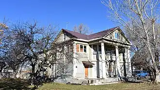 The A.K. Steunenberg House in Caldwell, Idaho, is a 2-story Colonial Revival expansion by Tourtellotte & Co. in 1904 of a smaller Queen Anne house. The 1904 renovation established a 2-story, round corner tower and a colonnade with three prominent columns marking the Kimball Street exposure.[2] The original house at the northwest corner of North 4th and Kimball Streets may have been occupied by the Steunenbergs as early as 1890.[3]