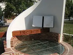In 2006, the Macedonian town of Ohrid erected a monument in honor of A. den Doolaard and renamed a square to commemorate him. The monument was designed by the Macedonian architect, Vladimir Toić, based on an idea conceived by Peter John Bosse, president and founder of the Dutch Chamber of Commerce in Macedonia.[2] In 2011, a memorial room opened in Ohrid with an exhibition of books and documents explaining the life and work of the author.[3] The exhibition was organized by the Macedonian writer and photographer Mišo Juzmeski, who also has published articles on the meaning of den Doolaard for the development of the Dutch-Macedonian relations.[4]