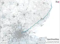 The A12 is a major road in Eastern England. It runs north-east/south-west between London and the coastal town of Lowestoft in the north-eastern corner of Suffolk, following a similar route to the Great Eastern Main Line until Ipswich. A section of the road between Lowestoft and Great Yarmouth became part of the A47 in 2017.[1] Between the junctions with the M25 and the A14, the A12 forms part of the unsigned Euroroute E30 (prior to 1985, it was the E8). Unlike most A roads, this section of the A12, together with the A14 and the A55, has junction numbers as if it were a motorway.