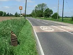 A152 at Monks Hall, showing speed limit and 19th century milepost