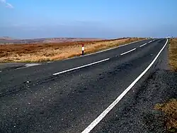 The section between Greenfield and Holmfirth, which passes across Saddleworth Moor, is known locally as the Isle of Skye Road after a public house that was at Wessenden Head until it was demolished in the 1950s after a fire.[2][3] It passes over treeless high moor top for about 4 miles: Saddleworth Moor west of the watershed and Wessenden Head Moor to the east. This section of the road is at high altitude and in winter months local snowfall usually results in closures of the road. In January 2010, as a result of the extreme winter, the road was closed for over a month, and other closures also occurred in the same winter.