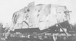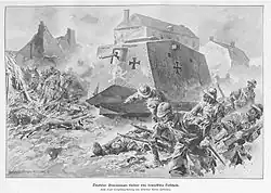 The Sturmpanzerwagen A7V was a heavy tank introduced by Germany in 1918 during World War I. One hundred chassis were ordered in early 1917, ten to be finished as fighting vehicles with armoured bodies, and the remainder as Überlandwagen cargo carriers.[2] The number to be armoured was later increased to 20. They were used in action from March to October 1918, and were the only tanks produced by Germany in World War I to be used in combat, as well as being the first operational German tank.[3] Although various German armoured vehicle proposals were shown a modest amount of support early in the war, enthusiasm among German high command was low and they were given little funding and attention. The sudden appearance of the British Mark series of tanks causing panic amongst the German infantry led this to be reconsidered however, and development on the German tank program began.[4]
