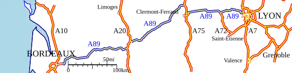 The A89 autoroute is an autoroute in central France. It is known as the La Transeuropéenne. It connects Bordeaux (from Libourne) and Lyon (at Limonest) via Clermont-Ferrand. Its total length is 544 km (338 mi).