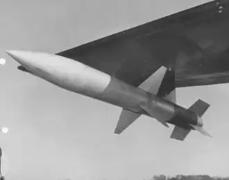 Development of the AAM-N-4 Oriole began in 1947, when a development contract was awarded by the United States Navy's Bureau of Ordnance to the Glenn L. Martin Company to develop a heavy air-to-air missile,[1] utilizing active radar homing for fire and forget operation,[2] for launch from aircraft operating from aircraft carriers.[3] Oriole was intended to utilize a rocket[4] or rocket-ramjet propulsion system; the intended range of the weapon was 20 miles (32 km),[5] however as tested it was limited to a range of approximately 10 miles (16 km).[3] Ready for launch, the missile weighed 1,500 pounds (680 kg),[6] and used cruciform fins at the missile's midbody and at the tail for flight control.[7] Flight speed was originally intended to be above Mach 3.[8]