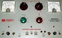 A high-voltage power supply is one that outputs hundreds or thousands of volts. A special output connector is used that prevents arcing, insulation breakdown and accidental human contact. Federal Standard connectors are typically used for applications above 20 kV, though other types of connectors (e.g., SHV connector) may be used at lower voltages. Some high-voltage power supplies provide an analog input or digital communication interface that can be used to control the output voltage. High-voltage power supplies are commonly used to accelerate and manipulate electron and ion beams in equipment such as x-ray generators, electron microscopes, and focused ion beam columns, and in a variety of other applications, including electrophoresis and electrostatics.