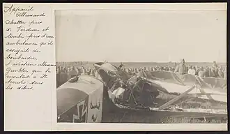 - Probably Villeselve, France. 19 April 1918. The tangled wreckage of a crashed AEG J I aircraft of a German squadron, probably Bayrische Flieger Abteilung 287 (Bavarian Flying Section 287), in a field. Leutnant Major Vizefeldwebel Benz was killed in this crash.