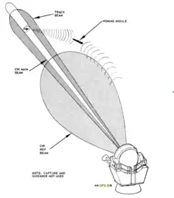The two X-band feed horns are mounted back-to-back near the focus of the parabolic surface. The X-band feed horn facing the main dish radiates vertically polarized RF energy. The subdish is transparent to this radiation, and the main dish reflects it as a narrow beam for CW illumination. The X-band feed horn facing away from the main dish transmits X-band, vertically polarized RF energy as a broad beam centered about the main CW illuminating beam. This provides the rear reference beam, which provides the missile with identification of the proper illumination radar.[5][6]