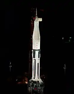 The first stage was erected at the pad soon after arriving at Cape Kennedy. The second stage joined it on October 1. After fixing some problems in the Instrument Unit it was mated to the S-IVB on October 25. The CSM was mated on December 26.[3]: 369