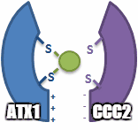 ATOX1 transfers Cu(I) to transporters ATP7A and ATP7B.[7][8][9] Transfer occurs via a ligand exchange mechanism, where Cu(I) transiently adopts a 3-coordinate geometry with cysteine ligands from ATOX1 and the associated transporter.[9] The ligand exchange mechanism allows for faster exchange than a diffusion mechanism and imparts specificity for both the metal and transporter.[11] Since the ligand exchange accelerates that transfer and the reaction has a shallow thermodynamic gradient, it is said to be under kinetic control rather than thermodynamic control.[9][11]