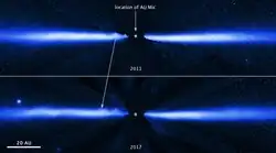 - ^ Boccaletti, A.; Sezestre, E.; Lagrange, A.-M.; Thébault, P.; Gratton, R.; Langlois, M.; Thalmann, C.; Janson, M.; Delorme, P.; Augereau, J.-C.; Schneider, G.; Milli, J.; Grady, C.; Debes, J.; Kral, Q. (2018-06-01). "Observations of fast-moving features in the debris disk of AU Mic on a three-year timescale: Confirmation and new discoveries". Astronomy & Astrophysics. 614: A52. arXiv:1803.05354. Bibcode:2018A&A...614A..52B. doi:10.1051/0004-6361/201732462. ISSN 0004-6361.