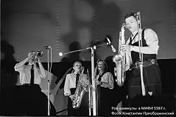 In 1987 AVIA received the special Press Award at the Rock Panorama musical festival and featured in Alexey Uchitel's film "Rock". The group's first album, the studio recording of their concept stage performance Из жизни композитора Зудова (From the Life of Composer Zudov) remained unreleased. After the release of АВИА Всем! (AVIA to Everybody!), formally a debut, but in effect, the second album, they gave concerts in Finland and Yugoslavia and started to appear on the Soviet TV. Anton Adasinsky departed in 1988 to form his own Дерево (Tree) Theatre and was replaced by Dmitry Tyulpanov and saxophonist Yevgeny Zhdanov. The line-up of the brass section changed too. The extensive European tour was followed by the international release of their debut: AVIA came out on Hannibal Records in England and received a 4 out of 5 stars rating from the Q magazine. Instrumental in this was the then Pink Floyd manager Peter Jenner.[1]
