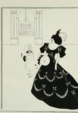 The painting seems to be inspired by the first of Beardsley's three images depicting "The Comedy-Ballet of Marionnettes, as performed by the troupe of the Theatre-Impossible, posed in three drawings", which were published in the second volume of the avant-garde art journal The Yellow Book in July 1894. In the illustration, drapes hanging in the arched doorway give it a phallic appearance. In the painting, the red-clothed dwarf with black face may represent female genitalia.