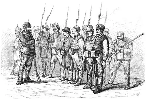 Caragiale's "conservative Weltanshauung", only occasionally juxtaposed over party politics, had been informed by Titu Maiorescu and the Junimea society: the Juminist critique of liberalism was, from its inception, centered on exposing the liberals' detrimental influence on the cultural sphere, and in particular on the written and spoken language.[4] Other than taking up this attack on liberal culture, A Stormy Night focuses mainly on the Civic Guard, an urban paramilitary formation that had been established in March 1866—its stated purpose was "to represent at the highest level the nation, the civilian population in its entirety, irrespective of its social standing and wealth, hereby called under arms and ever-ready to defend its country."[5] Originally favored by conservatives such as Dimitrie Ghica, it was thereafter monopolized by the radical-liberal bourgeoisie.[6] In his liberal phase, Caragiale had served in a Guard unit in Bucharest's Armenian Quarter—in one of his humorous memoirs, he recalls having paraded alongside baristas (cafegii), one of whom still wore an apron underneath his coat.[7] During the Romanian war of independence (1877–1878), both he and Maiorescu resisted pressures to show up for training as Guardists; Caragiale opted to give "repeated monetary contributions" in lieu of service.[6] As noted by Caragiale's associate Iacob Negruzzi, the Guard was rendered laughable during the war, when the regular Land Forces had displayed bravery on faraway battlefields.[8]