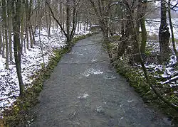 One of its particularities is the unnamed, left tributary, only a few hundred meters long, at the southernmost point of the Johannes-Gelhaus path at Reelsen, where one can observe the creek well. As a Tufa source and under the influence of moss the creek forms small Calcareous sinter. During the summer the creek dries out.