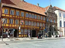 The city centre, dating from the Middle Ages, lies on a series of clay banks between the former streams of Vesterå and Lilleå, which used to run into the sound. Despite effective drainage, the main streets, including Algade, still run east to west while the side streets run north to south. The Budolfi Church and the old town hall line Gammeltorv, the old market square. The main shopping streets are Algade and Bispengade, the latter lying in between the modern Vesterbro thoroughfare and Nytorv square. Østerågade, once the old harbor, is noted for its merchants' mansions.[41]