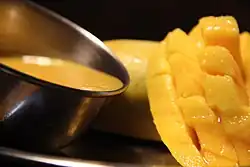 Aamras (also known as amras) is a Marathi sweet dish in the India made from the pulp of the mango fruit. The pulp of a ripe mango is extracted, usually by hand, and is eaten together with pooris or chapatis, Indian breads. Sometimes ghee and milk are added to the pulp to enhance its flavour. Sugar may be added for sweetness. It is often eaten at celebrations and weddings with cardamon and chopped fruits.