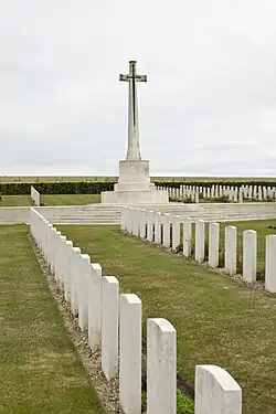There are a total of 2,102 interments in the Extension, with the identities of 107 of them not known. Of the identified burials, 1760 of them are of military personnel of the First World War while 244 are from the Second World War. The majority of the burials are British, but over 200 Australians and more than 100 Canadians are among the interments. Most of the unknown burials date from the Second World War.[2] A notable interment is the Scottish footballer William Gray, a corporal in the Seaforth Highlanders who died of wounds on 18 November 1916.[3][4] There are also 12 personnel of Queen Mary's Army Auxiliary Corps buried in the cemetery; most were casualties of an air raid that took place on 30 May 1918.[1]