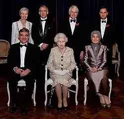 In September 2008 Gül became the first Turkish leader to visit Armenia where, in meetings with President Serzh Sarkisian, the two leaders formulated a solution to the tendentious problem of the genocide question, sparking a major debate in Turkey, but both the Armenian and Turkish parliaments refused to ratify the agreement.[37][38] In November 2011, President Gül led a state visit to the United Kingdom as a guest of Queen Elizabeth II.[39] The President met political and business leaders, visited the Olympic Park and was guest of honor at a state banquet at Buckingham Palace.