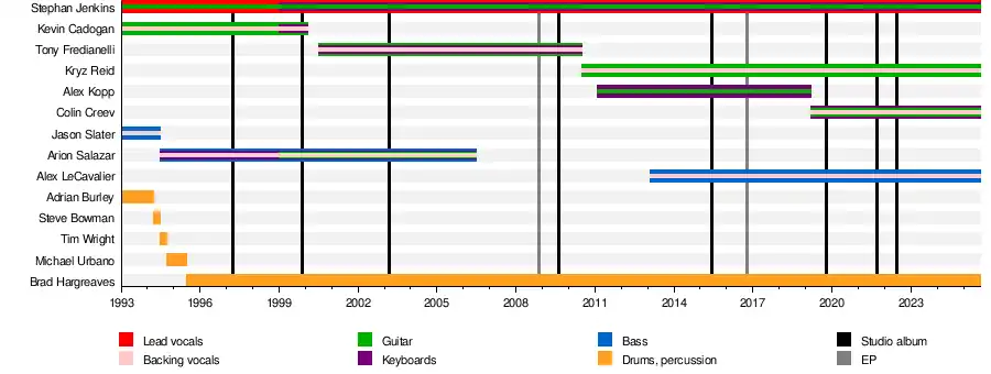 The band continued, but with many line-up changes and long gaps between album releases for the next 15 years. The band released Out of the Vein in 2003 and Ursa Major in 2009 with guitarist Tony Fredianelli, but parted ways with him shortly afterwards, leaving only Jenkins and Hargreaves as the remaining core members. The band's lineup stabilized again in the mid-2010s, adding Kryz Reid (lead guitar), Alex Kopp (keyboards), and Alex LeCavalier (bass guitar). The new lineup led to increased output with less time between releases - Dopamine (2015), and a string of EPs, We Are Drugs (2016) and Thanks for Everything (2018). After Kopp was replaced by Colin Creev, sixth and seventh studio albums Screamer (2019) and Our Bande Apart (2021) were released.