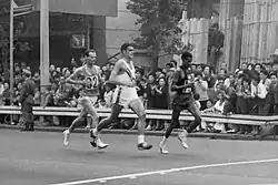 Between 5 km (3 mi) and 20 km (12 mi), the lead changed hands several times.[28] By about 25 km (16 mi), however, Abebe and ben Abdesselam moved away from the rest of the pack.[29] Trailing by about two minutes at the 30 km (19 mi) mark were New Zealand's Barry Magee, who was to finish third in 2:17:18.2[27] and Sergei Popov, the world marathon record holder at the time, who finished fifth.[30][31]