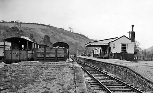 The station was incorporated into the Great Western Railway during the Grouping of 1923, passing on to the Western Region of British Railways on nationalisation in 1948. Passenger services were discontinued in 1951 and freight in 1963. The station was host to a GWR camp coach from 1934 to 1939.[2][3] A camping coach was also positioned here by the Western Region from 1952 to 1956, the coach was joined by another so there were two coaches from 1957 to 1962.[4]