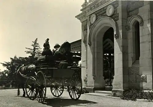 | Abercrombie House in 1909. From left to right are Ethel Allen (Arthur Allen's wife), Harriet Stewart, Albyn Stewart (Harriet's son), Helen Austin (a friend of the Allens) and Miss Lindsay. | A room in Abercrombie House in 1901. | A carriage outside Abercrombie House in 1901. |