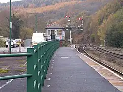 The original station buildings, including the Great Western Railway signal box of 1932 which originally came from Birmingham Moor Street station,[1] have been demolished, with the signal box being demolished near the end of 2013.
