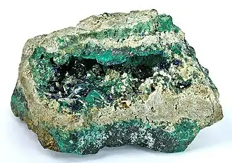 Clinoclase is a hydrous copper arsenate mineral, Cu3AsO4(OH)3. Clinoclase is a rare secondary copper mineral and forms acicular crystals in the fractured weathered zone above copper sulfide deposits. It occurs in vitreous, translucent dark blue to dark greenish blue colored crystals and botryoidal masses. The crystal system is monoclinic 2/m. It has a hardness of 2.5–3 and a relative density of 4.3. Associated minerals include malachite, olivenite, quartz, limonite, adamite, azurite, and brochantite among others.