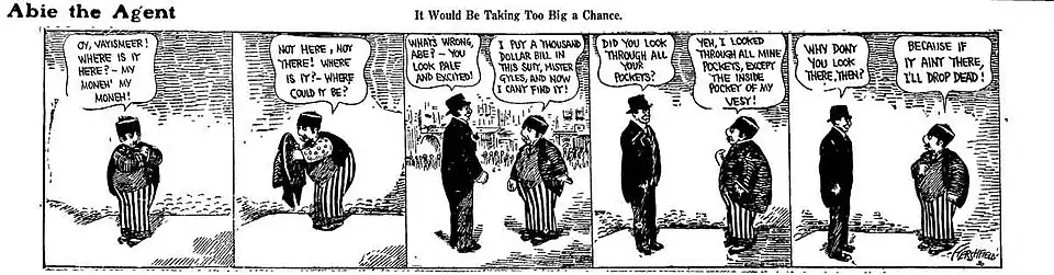 Abraham Kabibble, known as Abie the Agent, was the first Jewish protagonist of an American comic strip.[4] Abie's humorous caricature was a rebuttal of some of the Jewish stereotypes in caricatures, and represented a moderately successful middle-class immigrant.[5] Abie and his friends had many typical Jewish characteristics, such as their names or their use of Yiddish words and accents, they also lacked many of the negative or malicious elements, such as exaggerated physical traits, found in the depictions of Jews from this time. Abie was in many ways indistinguishable from other Americans. During 1917, the character enlisted in the United States Army to help the U.S. forces in World War I.