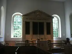 Though many Gloucester County records burned in either 1820 or 1865, a contract to expand the Abingdon church was discussed in 1751, and the current one-story brick church was probably finished in 1754 or 1755. The church has a Latin cross plan with gable roof, pedimented gable ends and modillioned cornice. Col. Lewis Burwell donated a communion set made in London in 1702 to the parish, which remains in use today. The church interior features an elaborate reredos. Following the disestablishment of the Episcopal Church in Virginia in 1802, the building fell into disrepair, although Methodists worshipped at Abingdon Church 1818–1822, and an Episcopal congregation was re-formed in 1826 and repaired the church in 1841. Federal troops occupied the church and caused damage, so it was also repaired in 1868, 1897 and 1950.[5]