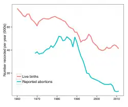 As of 2010, Croatia had 4.7 abortions per 1000 women of childbearing age, lower than in most European countries.[16] The highest percentage of abortion was recorded in the 1980s. In 1989, 49% of all pregnancies ended with an abortion.[17] During the Croatian War of Independence and after it, that percentage fell dramatically and still kept falling in the following years.