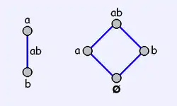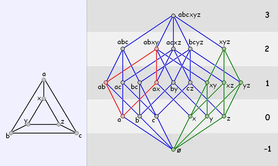 Smaller posets, and polytopes in particular, are often best visualized in a Hasse diagram, as shown. By convention, faces of equal rank are placed on the same vertical level. Each "line" between faces, say F, G, indicates an ordering relation < such that F < G where F is below G in the diagram.