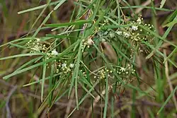 Acacia acrionastes is a spindly, glabrous shrub or tree that typically grows to a height of 2–8 m (6 ft 7 in – 26 ft 3 in). It has linear phyllodes that are 60–190 mm (2.4–7.5 in) long and 2–5 mm (0.079–0.197 in) wide and often narrower towards the tip. The flowers are arranged in a raceme 20–45 mm (0.79–1.77 in) long with 10 to 16 heads on a peduncle 3–6 mm (0.12–0.24 in) long, each head with 12 to 16 creamy yellow flowers. Flowering mainly occurs between July and August and the fruit is a leathery pod up to 100 mm (3.9 in) long and 8–10 mm (0.31–0.39 in) wide, containing up to nine seeds with a shiny black, club-shaped aril.[2][3][4][5]