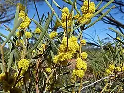 Acacia cana, commonly known as boree, cabbage-tree wattle or broad-leaved nealie,[3] is a species of flowering plant in the family Fabaceae and is endemic to eastern Australia. It is a shrub or tree with rigid, linear to very narrowly elliptic phyllodes, spherical heads of bright yellow flowers, and linear, leathery to papery pods.