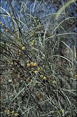 Wirewood is widely distributed in the north of Western Australia where it grows in sand or limestone on coastal dues and ridges, sandplains and along watercourses in the Avon Wheatbelt, Carnarvon, Gascoyne, Gibson Desert, Great Sandy Desert, Pilbara, Swan Coastal Plain, Tanami and Yalgoo bioregions.[6] Subspecies coriacea has a near coastal distribution in the Avon Wheatbelt, Carnarvon, Gascoyne, Pilbara, Yalgoo bioregions[14] and subsp. pendens in the Carnarvon, Gascoyne, Pilbara and Swan Coastal Plain bioregions.[15]
