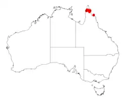 It is found on the Cape York Peninsula of Queensland from around Weipa in the west to around Bowden and the Pascoe and Wenlock Rivers in the east. It is often situated on shell mounds or along sandy river or creek banks as a part of fringing woodland communities along with species of Eucalyptus, Melaleuca, Leptospermum and other species of Acacia.[2]