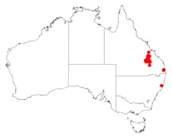 It is found in a small area of the Central Highlands region of Queensland on the Blackdown tableland to the south of Blackwater as a part of Eucalyptus woodland communities growing in sandy sandstone based soils.[1]