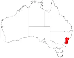 The shrub has a distribution in the Great Dividing Range and the associated foothills in western New South Wales from around Rylstone in the north down to around the Clyde River in the south where it is growing in sandy or loamy soils as a part of heath and Eucalyptus woodland communities.[2] It is often found on and around sandstone outcrops as a part of dry sclerophyll forest and heathland communities.[1]