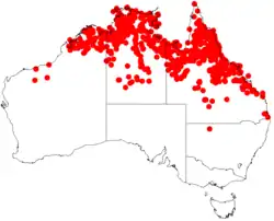 The shrub is found in northern parts of Australia in Western Australia, the Northern Territory and Queensland.[5] The range of the bulk of the population extends from around near Derby in the Kimberley region of Western Australia to the east through the top end of the Northern Territory as far as Rockhampton in eastern Queensland. Smaller populations are found in arid regions of the Pilbara in the Hamersley Range, in central parts of the Northern Territory and in southwestern Queensland. It is found in and around ephemeral watercourses growing in gravelly sand or loamy soils.[3]