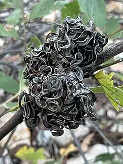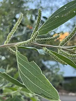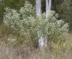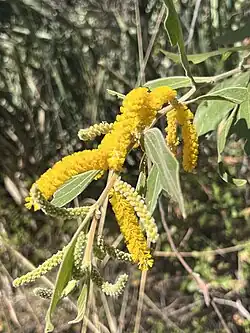The shrub has a spreading habit and typically grows to a height of 3 m (9.8 ft) and a width of 4 m (13 ft).[5] The large grey-green phyllodes have an ovate-lanceolate shape with a length of 10 to 25 cm (4 to 10 in) and a width of 2 to 9 cm (0.8 to 3.5 in) and are covered with white silky hairs, with three to four prominent veins. The flowers are rod-like and bright yellow, 3–5 cm long. The thinly crustaceous seed pods that form after flowering are tightly irregularly coiled and have a width of 2.5 to 4 mm (0.1 to 0.2 in).[3] The pods are 3 to 5 cm (1.2 to 2.0 in) in length and twisted and curled.[6] The shiny dark brown seeds are arranged longitudinally in the pods and have an obloid-ellipsoid shape and are 3 to 5 mm (0.1 to 0.2 in) in length with a bright yellow aril.[3] The seed is edible.[7][8]