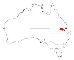 The plant has a limited range in the Roma and Mitchell area of southern Queensland where it is found growing in texture contrast soils often as a part woodland communities featuring stands of Eucalyptus populnea.[1] It is found in the Maranoa Region including around Morven and is also found to the west of Kingaroy. It is commonly situated on plains or flat terrain, that can be periodically inundated following rainfall events growing in dark brown, heavy clay loamy soils that usually are quite boggy once wet.[4]