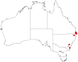 It is endemic to south eastern parts of Queensland and north eastern parts of New South Wales where it is often found along the margins of rainforest communities.[2]