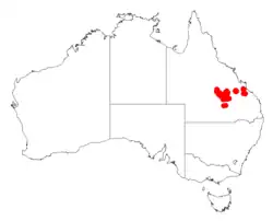 It is found in parts of the Great Dividing Range in Queensland from around Jericho and Tambo in the west out to around Biloela in the east growing in shallow sandy soils over and around sandstone as a part of Eucalyptus woodland communities.[1]
