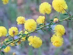 The shrub typically grows to a height of 1.5 m (4 ft 11 in) branches freely, and has flexuose and spine-tipped pale green branchlets and 1 mm (0.039 in) stipules. The leaves are composed of three to five pinnae.[3] Prickly moses is one of only few Acacia species to have true leaves rather than phyllodes. It has feathery, bipinnate leaves with leaflets up to 5 mm long. At the base of each leaf is one or two spines. It flowers in late winter and early spring. The rudimentary inflorescences occur in groups of one to three racemose spherical flower heads with a diameter of about 1 cm (0.39 in), usually containing 10 to 40 but sometimes up to 60 golden coloured flowers. The crustaceous seed pods that form after flowering have a narrowly oblong shape and are flat or slightly undulate with a length of 1.5 to 5 cm (0.59 to 1.97 in) and a width of 3 to 5 mm (0.12 to 0.20 in).The brown seeds inside are mostly oblong and 2.5 to 4.5 mm (0.098 to 0.177 in) in length.[4] The name "prickly moses" is said to be a corruption of "prickly mimosa".