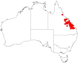 It is endemic along the east coast of central Queensland where it is found from around Eidsvold in the south to around Clermont in the north with another disjunct population near Mount Garnett further north where it is a part of Eucalyptus woodland communities.[1] It is often situated in hilly areas or undulating plains in the eastern part of the brigalow belt where it grows in skeletal sandy to clay soils with poor fertility where it is a part of open forest.[3]